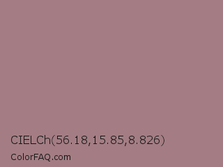 CIELCh 56.18,15.85,8.826 Color is a normal red color and the nearest color is Pharlap #a3807b. Hex code #a37d83 and RGB value is rgb(163,125,131). In RGB color space, this color is composed of 64% red, 49% green, 51% blue, In CMYK color space, this color is composed of 0% cyan, 23% magenta, 20% yellow , 36% black , In HSL color space, this color has a hue angle of 351° , 17% saturation and 56% lightness.
