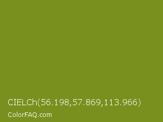 CIELCh 56.198,57.869,113.966 Color is a normal lime color and the nearest color is Wasabi #788a25. Hex code #79901f and RGB value is rgb(121,144,31). In RGB color space, this color is composed of 47% red, 56% green, 12% blue, In CMYK color space, this color is composed of 16% cyan, 0% magenta, 78% yellow , 44% black , In HSL color space, this color has a hue angle of 72° , 65% saturation and 34% lightness.