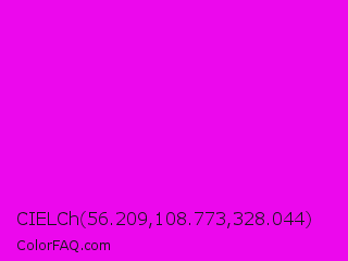 CIELCh 56.209,108.773,328.044 Color is a normal magenta color and the nearest color is Phlox #df00ff. Hex code #ec08ed and RGB value is rgb(236,8,237). In RGB color space, this color is composed of 93% red, 3% green, 93% blue, In CMYK color space, this color is composed of 0% cyan, 97% magenta, 0% yellow , 7% black , In HSL color space, this color has a hue angle of 300° , 93% saturation and 48% lightness.
