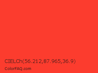 CIELCh 56.212,87.965,36.9 Color is a normal red color and the nearest color is Red Orange #ff3f34. Hex code #fc3c2e and RGB value is rgb(252,60,46). In RGB color space, this color is composed of 99% red, 24% green, 18% blue, In CMYK color space, this color is composed of 0% cyan, 76% magenta, 82% yellow , 1% black , In HSL color space, this color has a hue angle of 4° , 97% saturation and 58% lightness.