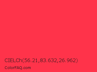 CIELCh 56.21,83.632,26.962 Color is a normal red color and the nearest color is Red Salsa #fd3a4a. Hex code #ff334a and RGB value is rgb(255,51,74). In RGB color space, this color is composed of 100% red, 20% green, 29% blue, In CMYK color space, this color is composed of 0% cyan, 80% magenta, 71% yellow , 0% black , In HSL color space, this color has a hue angle of 353° , 100% saturation and 60% lightness.