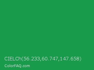 CIELCh 56.233,60.747,147.658 Color is a normal green color and the nearest color is Green Pigment #00a550. Hex code #189b4b and RGB value is rgb(24,155,75). In RGB color space, this color is composed of 9% red, 61% green, 29% blue, In CMYK color space, this color is composed of 85% cyan, 0% magenta, 52% yellow , 39% black , In HSL color space, this color has a hue angle of 143° , 73% saturation and 35% lightness.