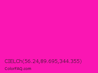 CIELCh 56.24,89.695,344.355 Color is a normal magenta color and the nearest color is Shocking Pink #fc0fc0. Hex code #fa16b3 and RGB value is rgb(250,22,179). In RGB color space, this color is composed of 98% red, 9% green, 70% blue, In CMYK color space, this color is composed of 0% cyan, 91% magenta, 28% yellow , 2% black , In HSL color space, this color has a hue angle of 319° , 96% saturation and 53% lightness.