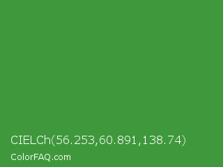 CIELCh 56.253,60.891,138.74 Color is a normal green color and the nearest color is May Green #4c9141. Hex code #3f993c and RGB value is rgb(63,153,60). In RGB color space, this color is composed of 25% red, 60% green, 24% blue, In CMYK color space, this color is composed of 59% cyan, 0% magenta, 61% yellow , 40% black , In HSL color space, this color has a hue angle of 118° , 44% saturation and 42% lightness.