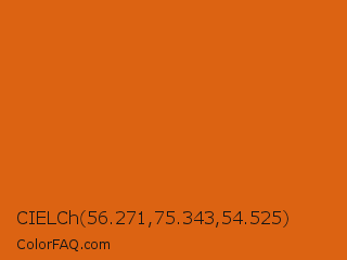 CIELCh 56.271,75.343,54.525 Color is a normal orange color and the nearest color is Bamboo #da6304. Hex code #dc6312 and RGB value is rgb(220,99,18). In RGB color space, this color is composed of 86% red, 39% green, 7% blue, In CMYK color space, this color is composed of 0% cyan, 55% magenta, 92% yellow , 14% black , In HSL color space, this color has a hue angle of 24° , 85% saturation and 47% lightness.