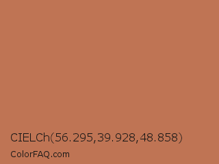 CIELCh 56.295,39.928,48.858 Color is a normal orange color and the nearest color is Copper Red #cb6d51. Hex code #bf7454 and RGB value is rgb(191,116,84). In RGB color space, this color is composed of 75% red, 45% green, 33% blue, In CMYK color space, this color is composed of 0% cyan, 39% magenta, 56% yellow , 25% black , In HSL color space, this color has a hue angle of 18° , 46% saturation and 54% lightness.
