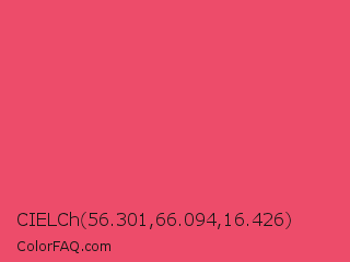 CIELCh 56.301,66.094,16.426 Color is a light red color and the nearest color is Mandy #e25465. Hex code #ed4c6a and RGB value is rgb(237,76,106). In RGB color space, this color is composed of 93% red, 30% green, 42% blue, In CMYK color space, this color is composed of 0% cyan, 68% magenta, 55% yellow , 7% black , In HSL color space, this color has a hue angle of 349° , 82% saturation and 61% lightness.