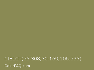 CIELCh 56.308,30.169,106.536 Color is a normal yellow color and the nearest color is Dark Tan #918151. Hex code #8a8a54 and RGB value is rgb(138,138,84). In RGB color space, this color is composed of 54% red, 54% green, 33% blue, In CMYK color space, this color is composed of 0% cyan, 0% magenta, 39% yellow , 46% black , In HSL color space, this color has a hue angle of 60° , 24% saturation and 44% lightness.