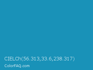 CIELCh 56.313,33.6,238.317 Color is a normal blue color and the nearest color is Cyan Cornflower Blue #188bc2. Hex code #1992b8 and RGB value is rgb(25,146,184). In RGB color space, this color is composed of 10% red, 57% green, 72% blue, In CMYK color space, this color is composed of 86% cyan, 21% magenta, 0% yellow , 28% black , In HSL color space, this color has a hue angle of 194° , 76% saturation and 41% lightness.