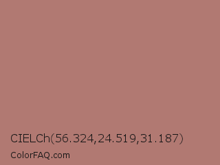 CIELCh 56.324,24.519,31.187 Color is a normal red color and the nearest color is Copper Penny #ad6f69. Hex code #b17972 and RGB value is rgb(177,121,114). In RGB color space, this color is composed of 69% red, 47% green, 45% blue, In CMYK color space, this color is composed of 0% cyan, 32% magenta, 36% yellow , 31% black , In HSL color space, this color has a hue angle of 7° , 29% saturation and 57% lightness.