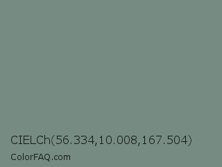 CIELCh 56.334,10.008,167.504 Color is a normal green color and the nearest color is Blue Smoke #748881. Hex code #768c83 and RGB value is rgb(118,140,131). In RGB color space, this color is composed of 46% red, 55% green, 51% blue, In CMYK color space, this color is composed of 16% cyan, 0% magenta, 6% yellow , 45% black , In HSL color space, this color has a hue angle of 155° , 9% saturation and 51% lightness.