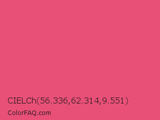 CIELCh 56.336,62.314,9.551 Color is a light rose color and the nearest color is Dark Pink #e75480. Hex code #e85078 and RGB value is rgb(232,80,120). In RGB color space, this color is composed of 91% red, 31% green, 47% blue, In CMYK color space, this color is composed of 0% cyan, 66% magenta, 48% yellow , 9% black , In HSL color space, this color has a hue angle of 344° , 77% saturation and 61% lightness.