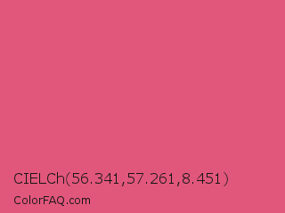 CIELCh 56.341,57.261,8.451 Color is a light rose color and the nearest color is Dark Pink #e75480. Hex code #e1577b and RGB value is rgb(225,87,123). In RGB color space, this color is composed of 88% red, 34% green, 48% blue, In CMYK color space, this color is composed of 0% cyan, 61% magenta, 45% yellow , 12% black , In HSL color space, this color has a hue angle of 344° , 70% saturation and 61% lightness.
