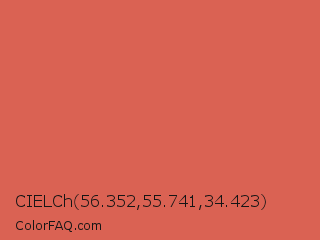 CIELCh 56.352,55.741,34.423 Color is a normal red color and the nearest color is Jelly Bean #da614e. Hex code #da6253 and RGB value is rgb(218,98,83). In RGB color space, this color is composed of 85% red, 38% green, 33% blue, In CMYK color space, this color is composed of 0% cyan, 55% magenta, 62% yellow , 15% black , In HSL color space, this color has a hue angle of 7° , 65% saturation and 59% lightness.