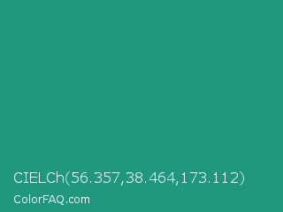 CIELCh 56.357,38.464,173.112 Color is a normal cyan color and the nearest color is Lochinvar #2c8c84. Hex code #20987e and RGB value is rgb(32,152,126). In RGB color space, this color is composed of 13% red, 60% green, 49% blue, In CMYK color space, this color is composed of 79% cyan, 0% magenta, 17% yellow , 40% black , In HSL color space, this color has a hue angle of 167° , 65% saturation and 36% lightness.