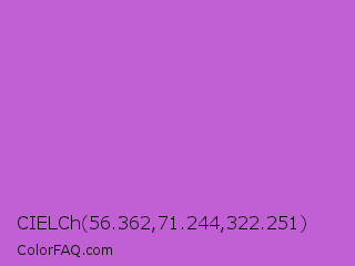 CIELCh 56.362,71.244,322.251 Color is a normal purple color and the nearest color is Medium Orchid #ba55d3. Hex code #c15fd4 and RGB value is rgb(193,95,212). In RGB color space, this color is composed of 76% red, 37% green, 83% blue, In CMYK color space, this color is composed of 9% cyan, 55% magenta, 0% yellow , 17% black , In HSL color space, this color has a hue angle of 290° , 58% saturation and 60% lightness.