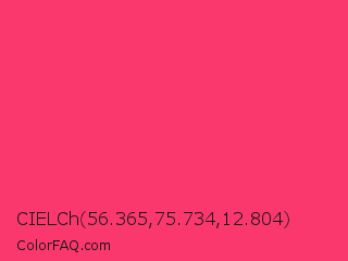 CIELCh 56.365,75.734,12.804 Color is a normal rose color and the nearest color is Neon Fuchsia #fe4164. Hex code #fa386e and RGB value is rgb(250,56,110). In RGB color space, this color is composed of 98% red, 22% green, 43% blue, In CMYK color space, this color is composed of 0% cyan, 78% magenta, 56% yellow , 2% black , In HSL color space, this color has a hue angle of 343° , 95% saturation and 60% lightness.