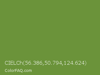 CIELCh 56.386,50.794,124.624 Color is a normal green color and the nearest color is Palm Leaf #6f9940. Hex code #6b933a and RGB value is rgb(107,147,58). In RGB color space, this color is composed of 42% red, 58% green, 23% blue, In CMYK color space, this color is composed of 27% cyan, 0% magenta, 61% yellow , 42% black , In HSL color space, this color has a hue angle of 87° , 43% saturation and 40% lightness.