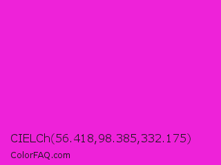CIELCh 56.418,98.385,332.175 Color is a normal magenta color and the nearest color is Hot Magenta #ff1dce. Hex code #ee22d9 and RGB value is rgb(238,34,217). In RGB color space, this color is composed of 93% red, 13% green, 85% blue, In CMYK color space, this color is composed of 0% cyan, 86% magenta, 9% yellow , 7% black , In HSL color space, this color has a hue angle of 306° , 86% saturation and 53% lightness.