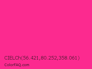 CIELCh 56.421,80.252,358.061 Color is a normal rose color and the nearest color is Wild Strawberry Crayola #ff3399. Hex code #fc2a8f and RGB value is rgb(252,42,143). In RGB color space, this color is composed of 99% red, 16% green, 56% blue, In CMYK color space, this color is composed of 0% cyan, 83% magenta, 43% yellow , 1% black , In HSL color space, this color has a hue angle of 331° , 97% saturation and 58% lightness.