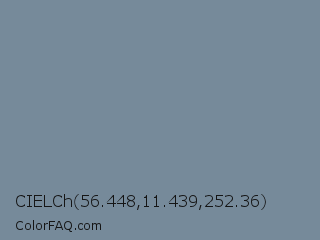 CIELCh 56.448,11.439,252.36 Color is a normal blue color and the nearest color is Light Slate Gray #778899. Hex code #768a9a and RGB value is rgb(118,138,154). In RGB color space, this color is composed of 46% red, 54% green, 60% blue, In CMYK color space, this color is composed of 23% cyan, 10% magenta, 0% yellow , 40% black , In HSL color space, this color has a hue angle of 207° , 15% saturation and 53% lightness.