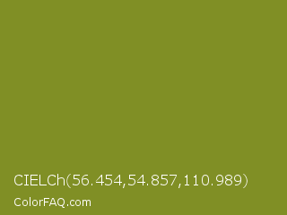 CIELCh 56.454,54.857,110.989 Color is a normal yellow color and the nearest color is Wasabi #788a25. Hex code #808f25 and RGB value is rgb(128,143,37). In RGB color space, this color is composed of 50% red, 56% green, 15% blue, In CMYK color space, this color is composed of 10% cyan, 0% magenta, 74% yellow , 44% black , In HSL color space, this color has a hue angle of 68° , 59% saturation and 35% lightness.
