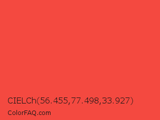 CIELCh 56.455,77.498,33.927 Color is a normal red color and the nearest color is Carmine Pink #eb4c42. Hex code #f44940 and RGB value is rgb(244,73,64). In RGB color space, this color is composed of 96% red, 29% green, 25% blue, In CMYK color space, this color is composed of 0% cyan, 70% magenta, 74% yellow , 4% black , In HSL color space, this color has a hue angle of 3° , 89% saturation and 60% lightness.