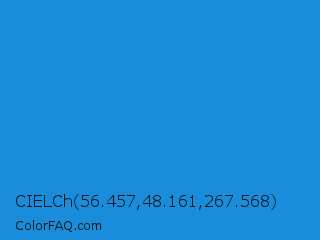 CIELCh 56.457,48.161,267.568 Color is a normal blue color and the nearest color is Curious Blue #2596d1. Hex code #198ddb and RGB value is rgb(25,141,219). In RGB color space, this color is composed of 10% red, 55% green, 86% blue, In CMYK color space, this color is composed of 89% cyan, 36% magenta, 0% yellow , 14% black , In HSL color space, this color has a hue angle of 204° , 80% saturation and 48% lightness.