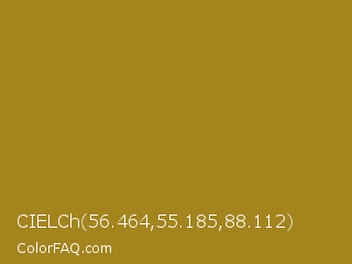 CIELCh 56.464,55.185,88.112 Color is a normal yellow color and the nearest color is Reef Gold #9f821c. Hex code #a3841d and RGB value is rgb(163,132,29). In RGB color space, this color is composed of 64% red, 52% green, 11% blue, In CMYK color space, this color is composed of 0% cyan, 19% magenta, 82% yellow , 36% black , In HSL color space, this color has a hue angle of 46° , 70% saturation and 38% lightness.