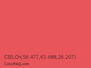 CIELCh 56.477,63.688,26.207 Color is a light red color and the nearest color is Mandy #e25465. Hex code #e8555a and RGB value is rgb(232,85,90). In RGB color space, this color is composed of 91% red, 33% green, 35% blue, In CMYK color space, this color is composed of 0% cyan, 63% magenta, 61% yellow , 9% black , In HSL color space, this color has a hue angle of 358° , 76% saturation and 62% lightness.