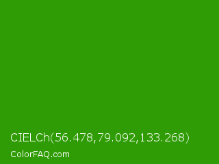 CIELCh 56.478,79.092,133.268 Color is a normal green color and the nearest color is Slimy Green #299617. Hex code #2f9c05 and RGB value is rgb(47,156,5). In RGB color space, this color is composed of 18% red, 61% green, 2% blue, In CMYK color space, this color is composed of 70% cyan, 0% magenta, 97% yellow , 39% black , In HSL color space, this color has a hue angle of 103° , 94% saturation and 32% lightness.