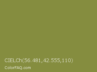 CIELCh 56.481,42.555,110 Color is a normal yellow color and the nearest color is Sycamore #908d39. Hex code #858d3f and RGB value is rgb(133,141,63). In RGB color space, this color is composed of 52% red, 55% green, 25% blue, In CMYK color space, this color is composed of 6% cyan, 0% magenta, 55% yellow , 45% black , In HSL color space, this color has a hue angle of 66° , 38% saturation and 40% lightness.
