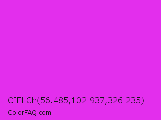 CIELCh 56.485,102.937,326.235 Color is a normal magenta color and the nearest color is Steel Pink #cc33cc. Hex code #e32eed and RGB value is rgb(227,46,237). In RGB color space, this color is composed of 89% red, 18% green, 93% blue, In CMYK color space, this color is composed of 4% cyan, 81% magenta, 0% yellow , 7% black , In HSL color space, this color has a hue angle of 297° , 84% saturation and 55% lightness.