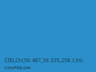 CIELCh 56.487,39.335,258.134 Color is a normal blue color and the nearest color is Curious Blue #2596d1. Hex code #2a8fca and RGB value is rgb(42,143,202). In RGB color space, this color is composed of 16% red, 56% green, 79% blue, In CMYK color space, this color is composed of 79% cyan, 29% magenta, 0% yellow , 21% black , In HSL color space, this color has a hue angle of 202° , 66% saturation and 48% lightness.