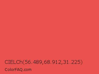 CIELCh 56.489,68.912,31.225 Color is a light red color and the nearest color is Carmine Pink #eb4c42. Hex code #ec524d and RGB value is rgb(236,82,77). In RGB color space, this color is composed of 93% red, 32% green, 30% blue, In CMYK color space, this color is composed of 0% cyan, 65% magenta, 67% yellow , 7% black , In HSL color space, this color has a hue angle of 2° , 81% saturation and 61% lightness.