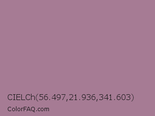 CIELCh 56.497,21.936,341.603 Color is a normal magenta color and the nearest color is Bouquet #ae809e. Hex code #a67b94 and RGB value is rgb(166,123,148). In RGB color space, this color is composed of 65% red, 48% green, 58% blue, In CMYK color space, this color is composed of 0% cyan, 26% magenta, 11% yellow , 35% black , In HSL color space, this color has a hue angle of 325° , 19% saturation and 57% lightness.