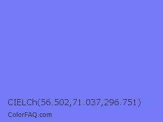 CIELCh 56.502,71.037,296.751 Color is a light blue color and the nearest color is Medium Slate Blue #7b68ee. Hex code #757af7 and RGB value is rgb(117,122,247). In RGB color space, this color is composed of 46% red, 48% green, 97% blue, In CMYK color space, this color is composed of 53% cyan, 51% magenta, 0% yellow , 3% black , In HSL color space, this color has a hue angle of 238° , 89% saturation and 71% lightness.