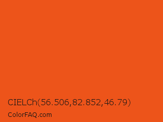 CIELCh 56.506,82.852,46.79 Color is a normal orange color and the nearest color is Flame #e25822. Hex code #ed541a and RGB value is rgb(237,84,26). In RGB color space, this color is composed of 93% red, 33% green, 10% blue, In CMYK color space, this color is composed of 0% cyan, 65% magenta, 89% yellow , 7% black , In HSL color space, this color has a hue angle of 16° , 85% saturation and 52% lightness.