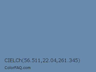 CIELCh 56.511,22.04,261.345 Color is a normal blue color and the nearest color is Bermuda Gray #6b8ba2. Hex code #688bad and RGB value is rgb(104,139,173). In RGB color space, this color is composed of 41% red, 55% green, 68% blue, In CMYK color space, this color is composed of 40% cyan, 20% magenta, 0% yellow , 32% black , In HSL color space, this color has a hue angle of 210° , 30% saturation and 54% lightness.