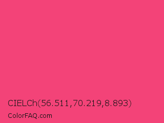 CIELCh 56.511,70.219,8.893 Color is a light rose color and the nearest color is Sasquatch Socks #ff4681. Hex code #f34378 and RGB value is rgb(243,67,120). In RGB color space, this color is composed of 95% red, 26% green, 47% blue, In CMYK color space, this color is composed of 0% cyan, 72% magenta, 51% yellow , 5% black , In HSL color space, this color has a hue angle of 342° , 88% saturation and 61% lightness.