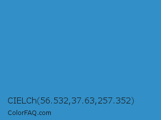 CIELCh 56.532,37.63,257.352 Color is a normal blue color and the nearest color is Curious Blue #2596d1. Hex code #328fc7 and RGB value is rgb(50,143,199). In RGB color space, this color is composed of 20% red, 56% green, 78% blue, In CMYK color space, this color is composed of 75% cyan, 28% magenta, 0% yellow , 22% black , In HSL color space, this color has a hue angle of 203° , 60% saturation and 49% lightness.