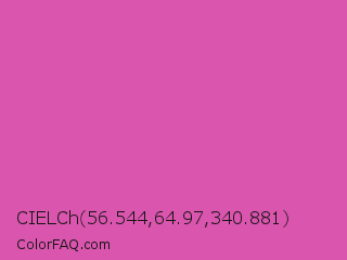 CIELCh 56.544,64.97,340.881 Color is a normal magenta color and the nearest color is Raspberry Pink #e25098. Hex code #da55ae and RGB value is rgb(218,85,174). In RGB color space, this color is composed of 85% red, 33% green, 68% blue, In CMYK color space, this color is composed of 0% cyan, 61% magenta, 20% yellow , 15% black , In HSL color space, this color has a hue angle of 320° , 64% saturation and 59% lightness.