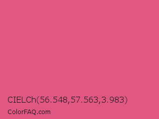 CIELCh 56.548,57.563,3.983 Color is a light rose color and the nearest color is Fandango Pink #de5285. Hex code #e15783 and RGB value is rgb(225,87,131). In RGB color space, this color is composed of 88% red, 34% green, 51% blue, In CMYK color space, this color is composed of 0% cyan, 61% magenta, 42% yellow , 12% black , In HSL color space, this color has a hue angle of 341° , 70% saturation and 61% lightness.