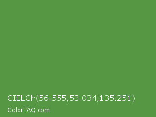 CIELCh 56.555,53.034,135.251 Color is a normal green color and the nearest color is May Green #4c9141. Hex code #559743 and RGB value is rgb(85,151,67). In RGB color space, this color is composed of 33% red, 59% green, 26% blue, In CMYK color space, this color is composed of 44% cyan, 0% magenta, 56% yellow , 41% black , In HSL color space, this color has a hue angle of 107° , 39% saturation and 43% lightness.