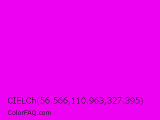 CIELCh 56.566,110.963,327.395 Color is a normal magenta color and the nearest color is Phlox #df00ff. Hex code #ed03f2 and RGB value is rgb(237,3,242). In RGB color space, this color is composed of 93% red, 1% green, 95% blue, In CMYK color space, this color is composed of 2% cyan, 99% magenta, 0% yellow , 5% black , In HSL color space, this color has a hue angle of 299° , 98% saturation and 48% lightness.