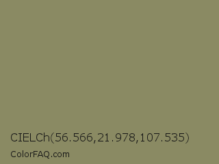 CIELCh 56.566,21.978,107.535 Color is a normal yellow color and the nearest color is Avocado Pulp #888d65. Hex code #8a8a63 and RGB value is rgb(138,138,99). In RGB color space, this color is composed of 54% red, 54% green, 39% blue, In CMYK color space, this color is composed of 0% cyan, 0% magenta, 28% yellow , 46% black , In HSL color space, this color has a hue angle of 60° , 16% saturation and 46% lightness.