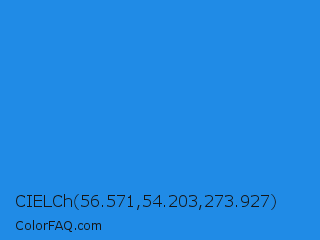 CIELCh 56.571,54.203,273.927 Color is a normal blue color and the nearest color is Bleu De France #318ce7. Hex code #208be6 and RGB value is rgb(32,139,230). In RGB color space, this color is composed of 13% red, 55% green, 90% blue, In CMYK color space, this color is composed of 86% cyan, 40% magenta, 0% yellow , 10% black , In HSL color space, this color has a hue angle of 208° , 80% saturation and 51% lightness.