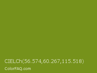 CIELCh 56.574,60.267,115.518 Color is a normal lime color and the nearest color is Trendy Green #7c881a. Hex code #76921b and RGB value is rgb(118,146,27). In RGB color space, this color is composed of 46% red, 57% green, 11% blue, In CMYK color space, this color is composed of 19% cyan, 0% magenta, 82% yellow , 43% black , In HSL color space, this color has a hue angle of 74° , 69% saturation and 34% lightness.