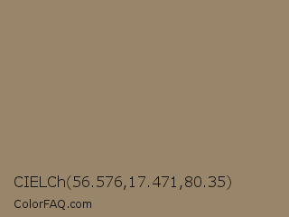 CIELCh 56.576,17.471,80.35 Color is a normal orange color and the nearest color is Arrowtown #948771. Hex code #98856a and RGB value is rgb(152,133,106). In RGB color space, this color is composed of 60% red, 52% green, 42% blue, In CMYK color space, this color is composed of 0% cyan, 13% magenta, 30% yellow , 40% black , In HSL color space, this color has a hue angle of 35° , 18% saturation and 51% lightness.