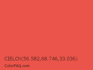 CIELCh 56.582,68.746,33.036 Color is a light red color and the nearest color is Carmine Pink #eb4c42. Hex code #eb544a and RGB value is rgb(235,84,74). In RGB color space, this color is composed of 92% red, 33% green, 29% blue, In CMYK color space, this color is composed of 0% cyan, 64% magenta, 69% yellow , 8% black , In HSL color space, this color has a hue angle of 4° , 80% saturation and 61% lightness.